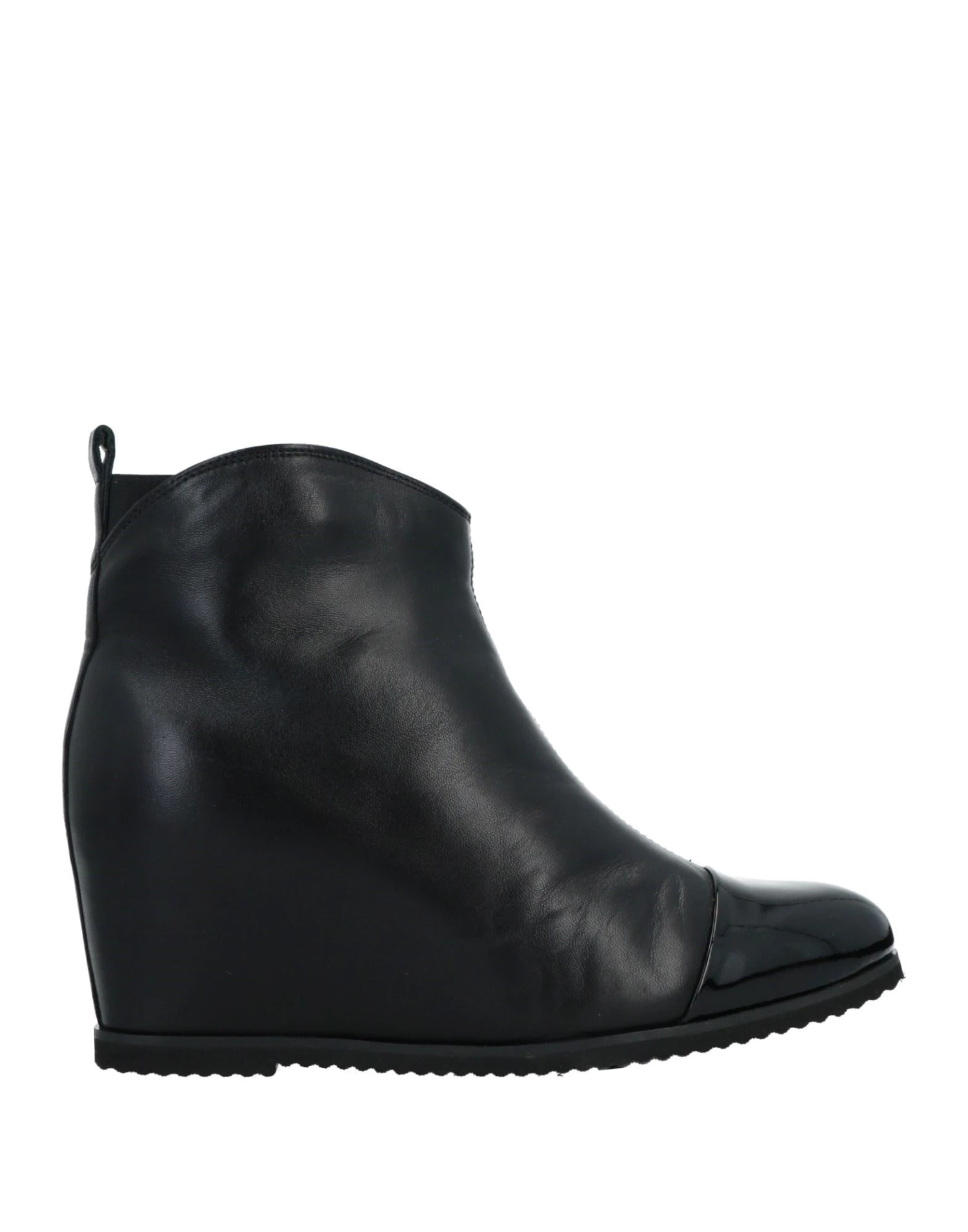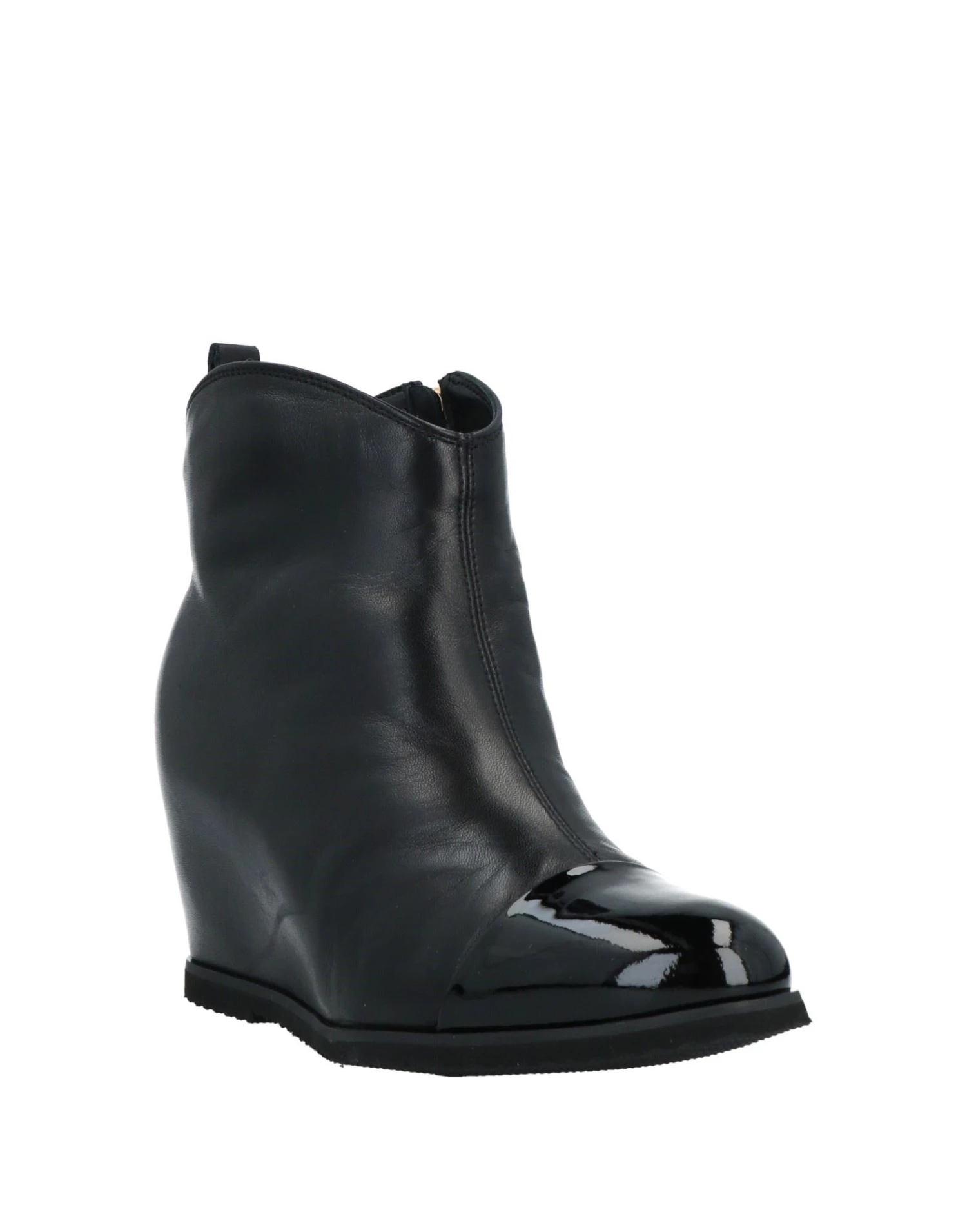 varnished effect, no appliqués, solid color, lined in goat hair, zipper closure, round toeline, covered heel, wedge heel, internal wedge heel, rubber cleated sole, contains non-textile parts of animal origin