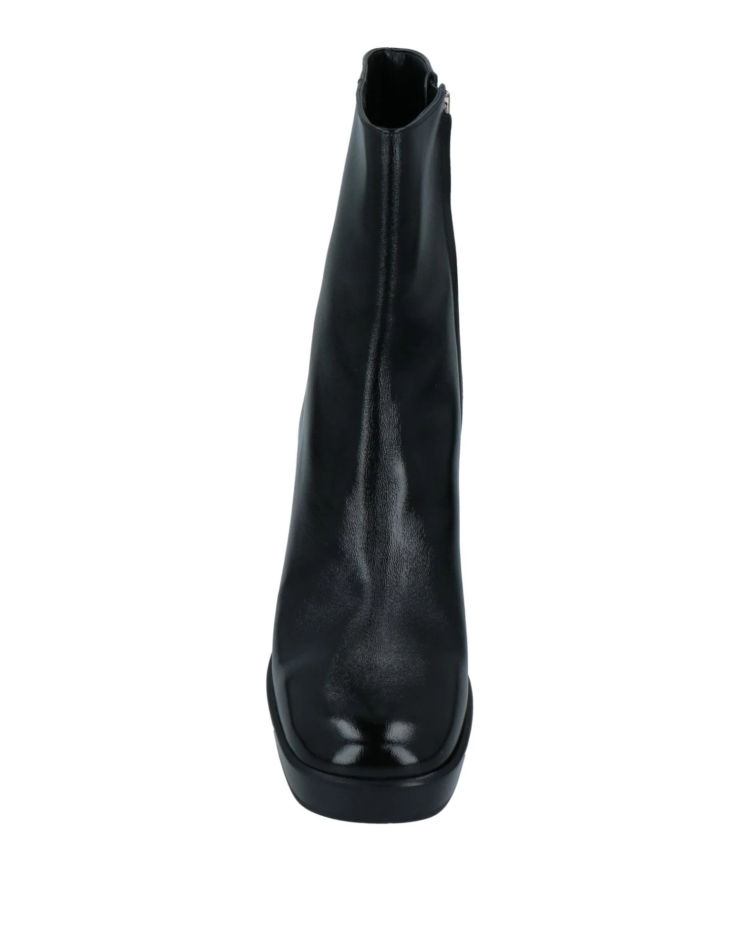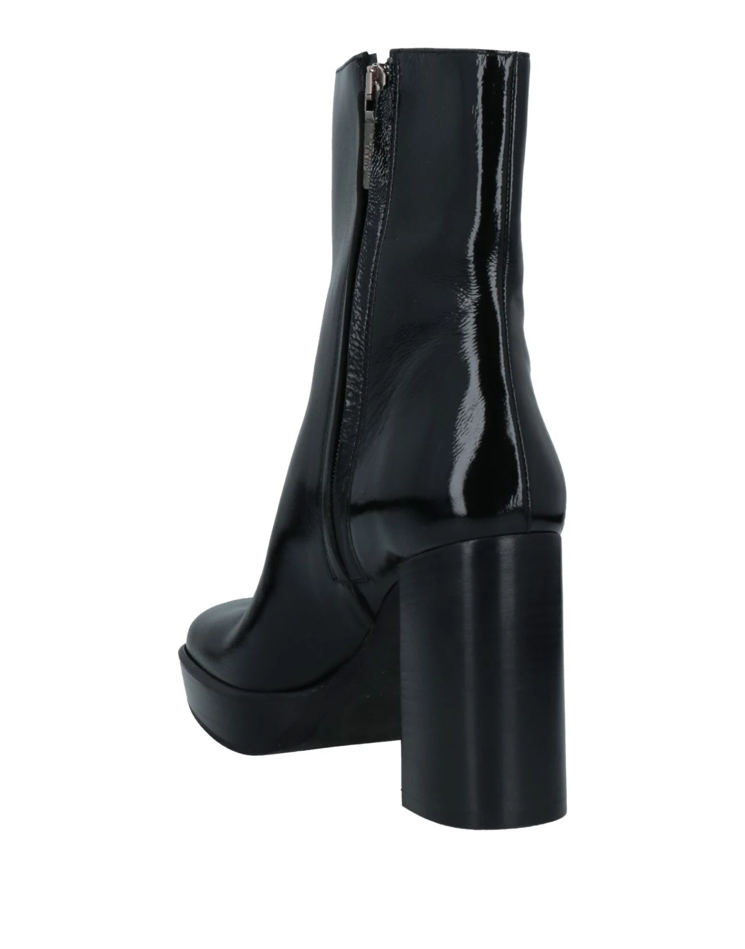 leather, varnished effect, brand logo, solid color, leather backing, zipper closure, round toeline, square heel, rubber sole, contains non-textile parts of animal origin