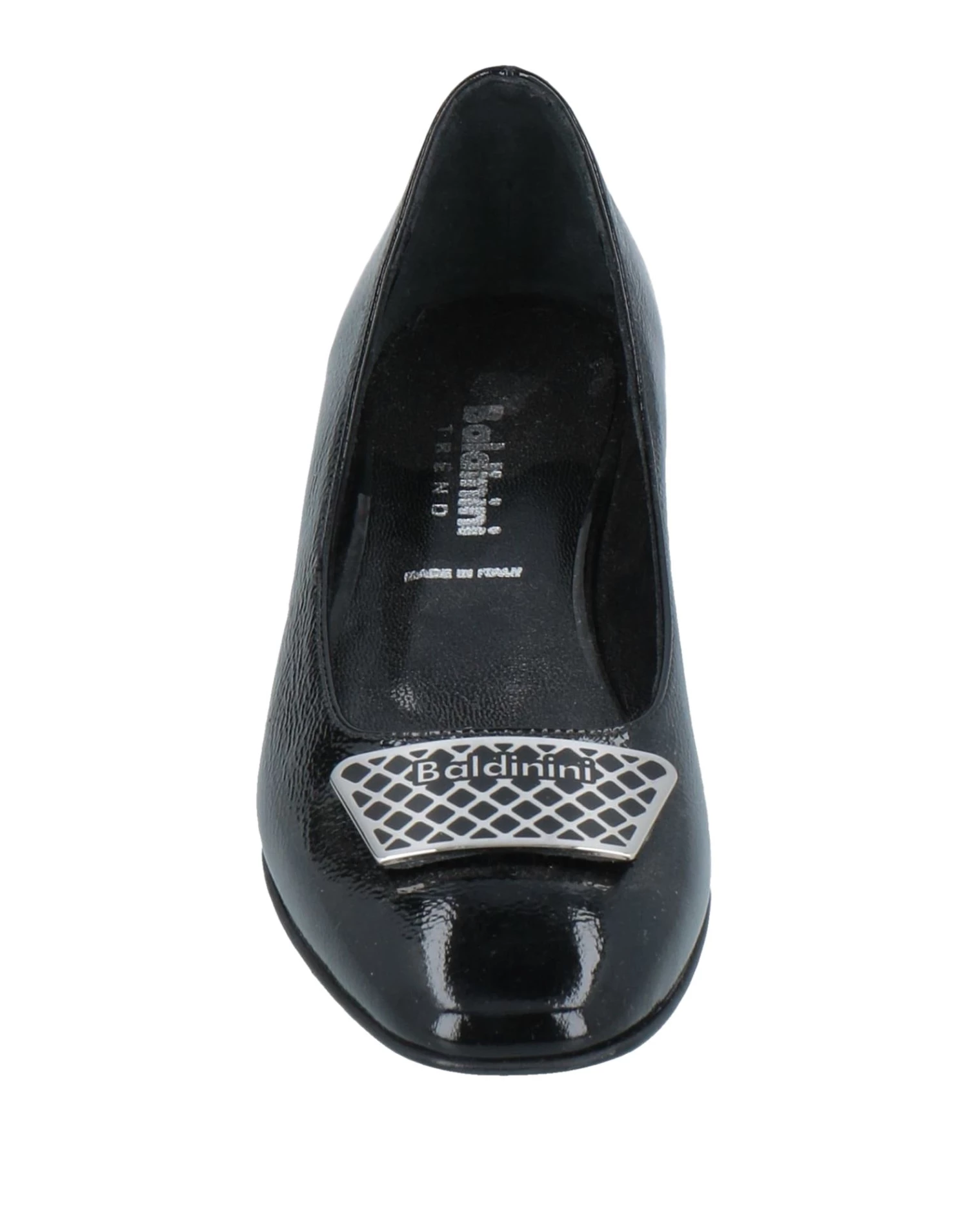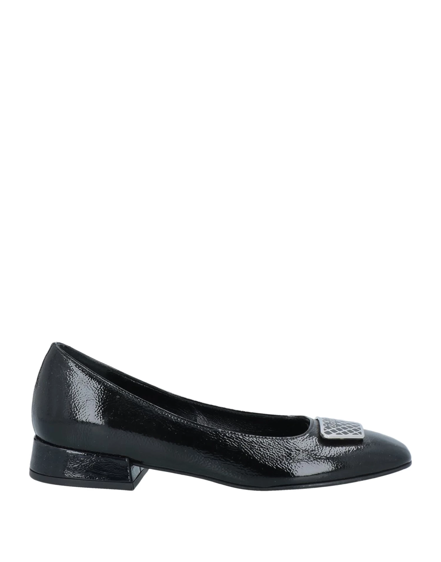 leather, varnished effect, contrasting applications, brand logo, solid colour with appliqués, leather backing, square toeline, flat, covered heel, rubber sole, contains non-textile parts of animal origin