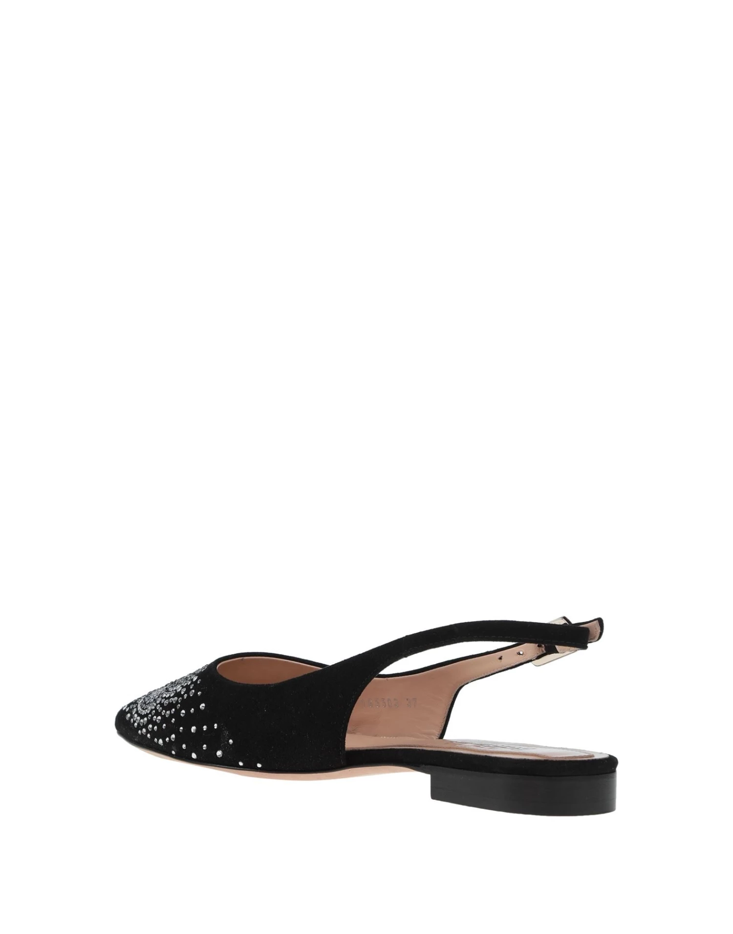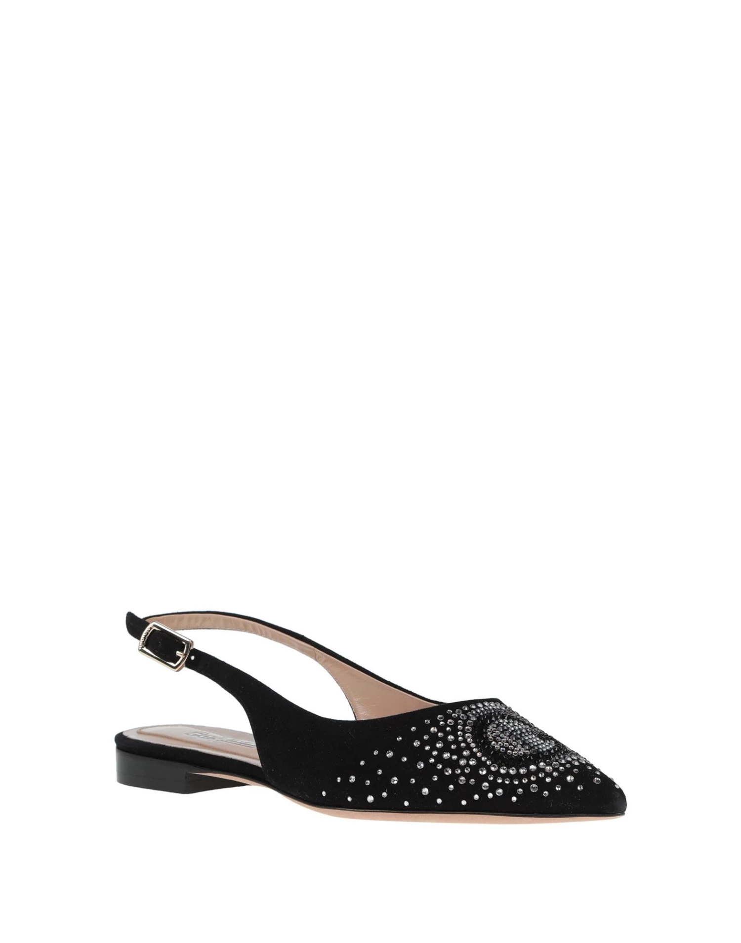 leather, suede effect, brand logo, glitter print, buckle fastening, narrow toeline, flat, leather lining, leather sole, solid colour with appliqués, contains non-textile parts of animal origin