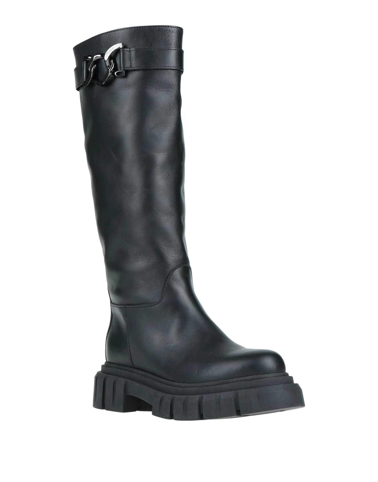 leather, metal applications, solid color, leather backing, round toeline, square heel, rubber cleated sole, contains non-textile parts of animal origin