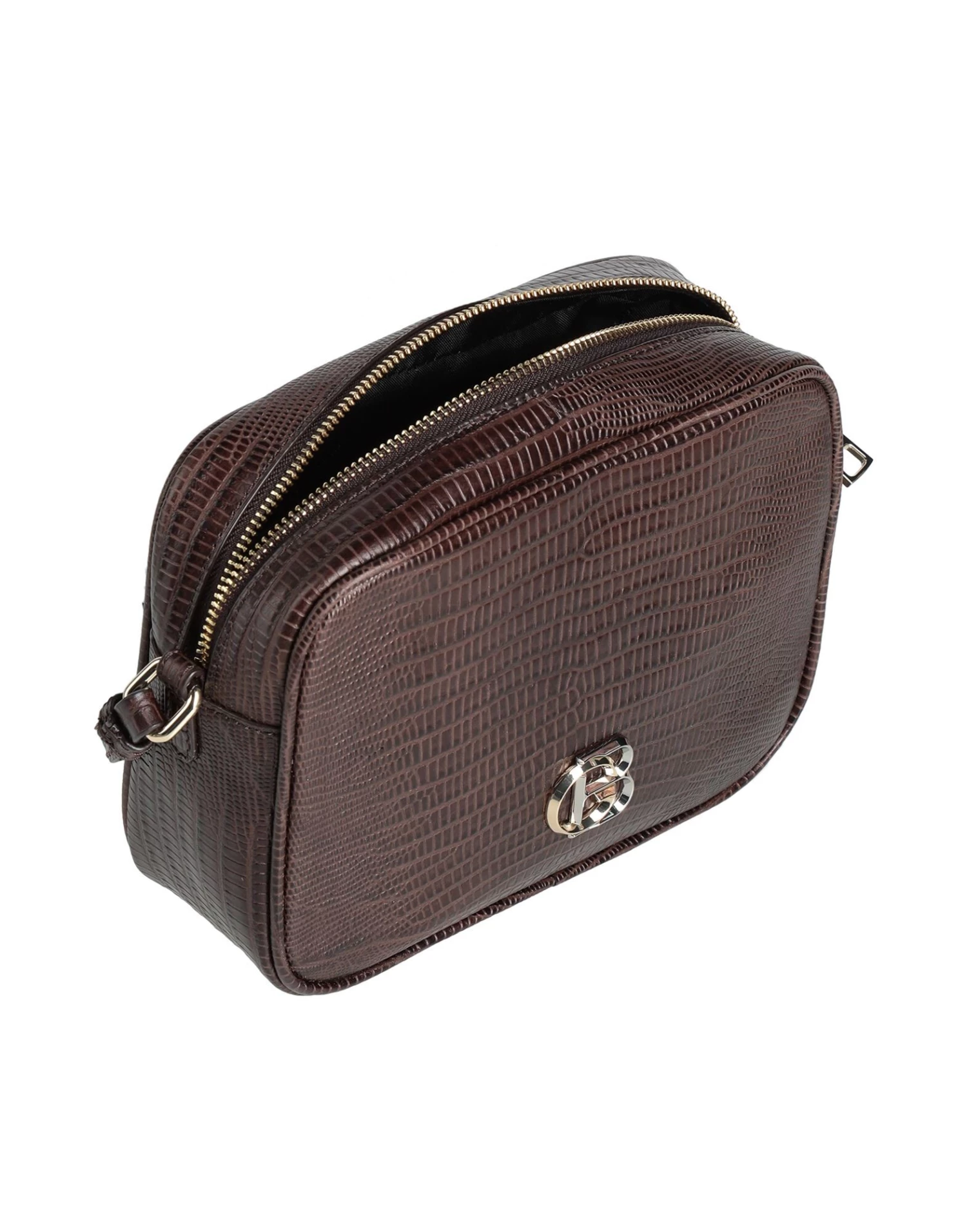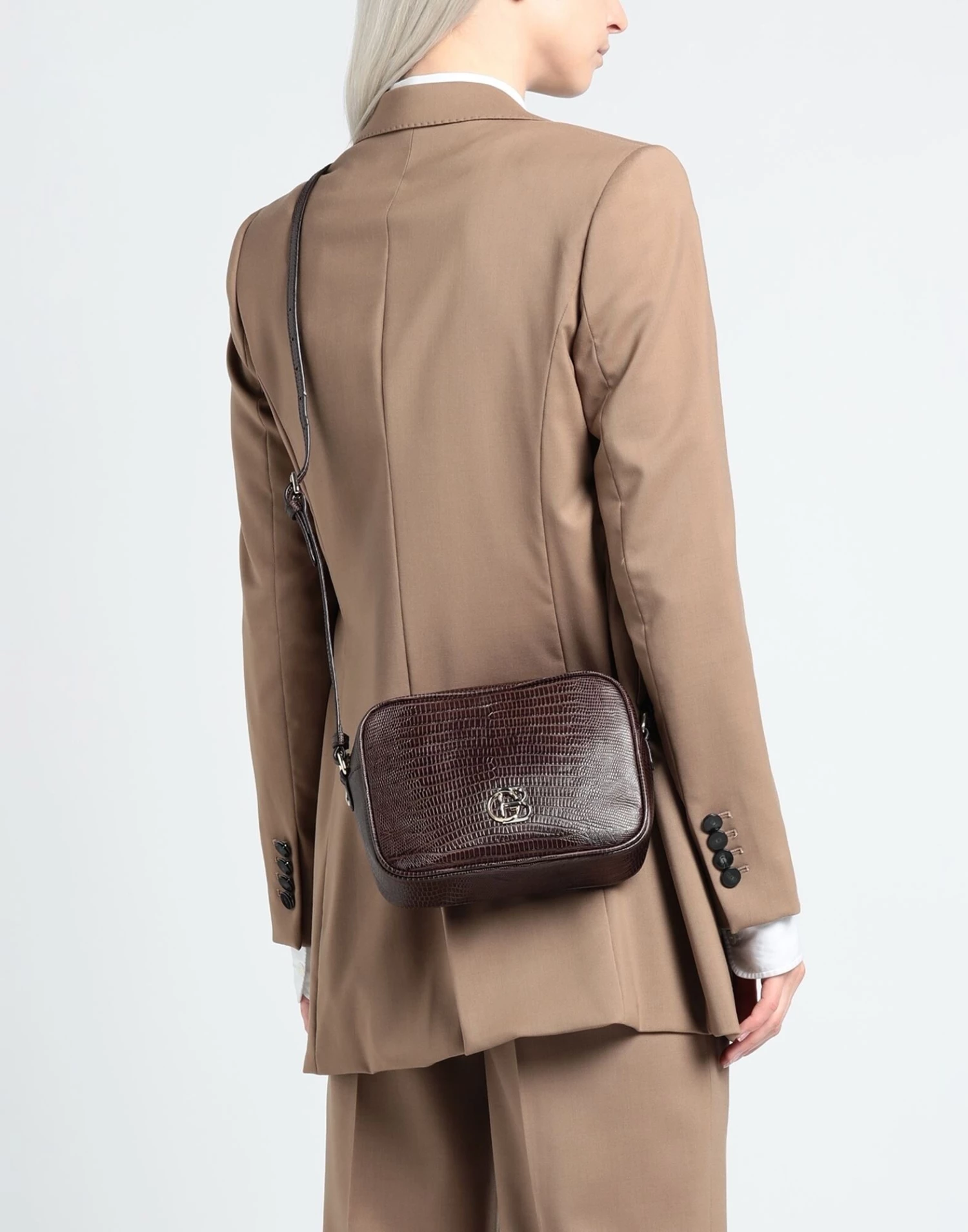 medium, leather, snakeskin print, brand logo, solid color, fully lined, zipper closure, internal zip pocket, adjustable shoulder strap, leather straps, daytime, contains non-textile parts of animal origin