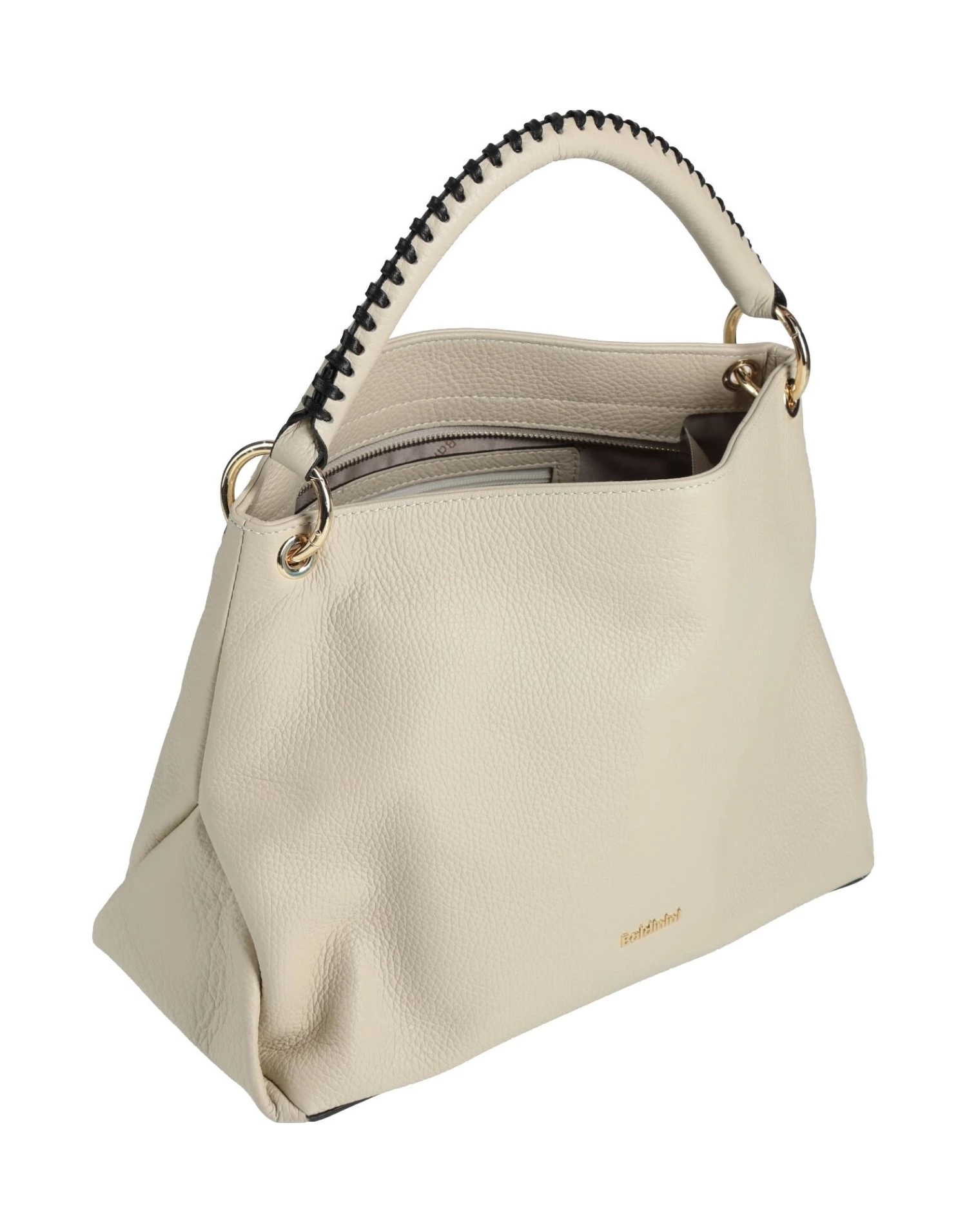 large, leather, textured leather, brand logo, solid color, fully lined, zipper closure, internal pockets, bag handle, daytime, contains non-textile parts of animal origin