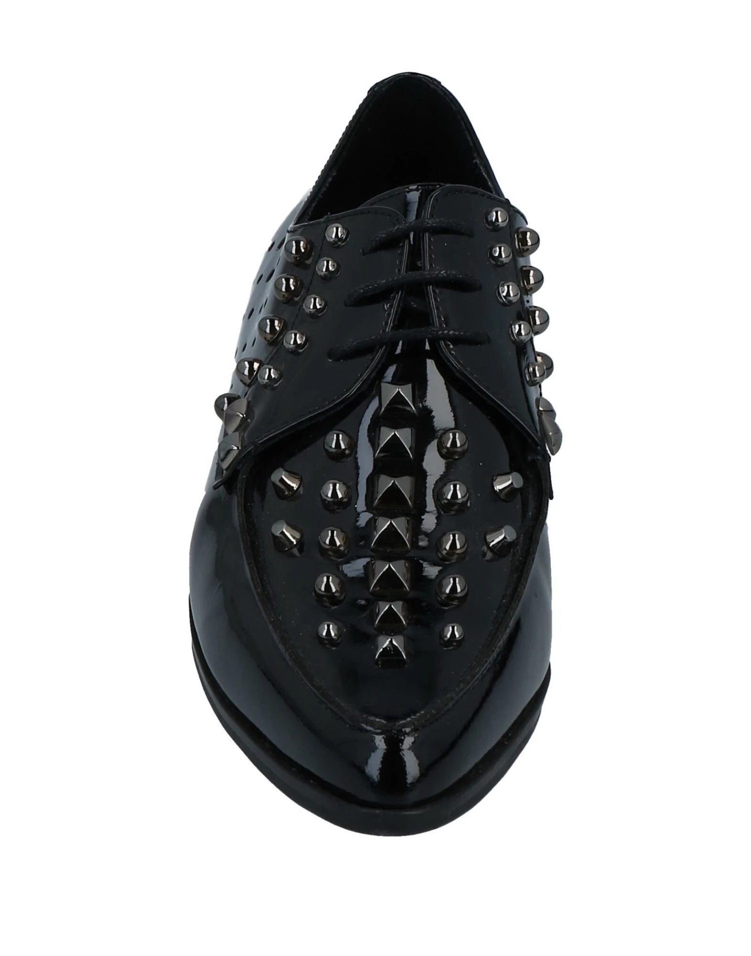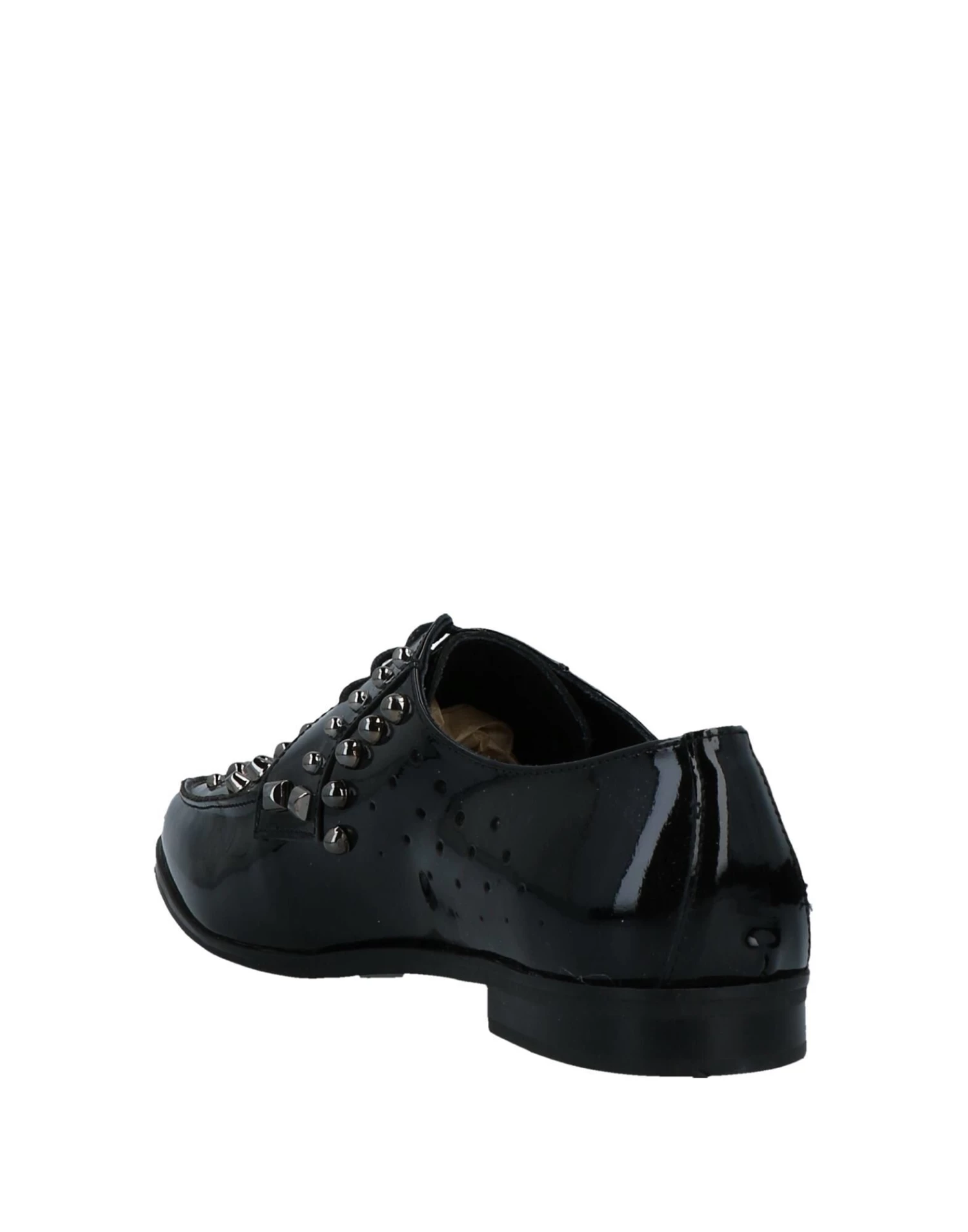 leather, varnished effect, studs, solid colour with appliqués, leather lining, narrow toeline, flat, leather/rubber sole, contains non-textile parts of animal origin