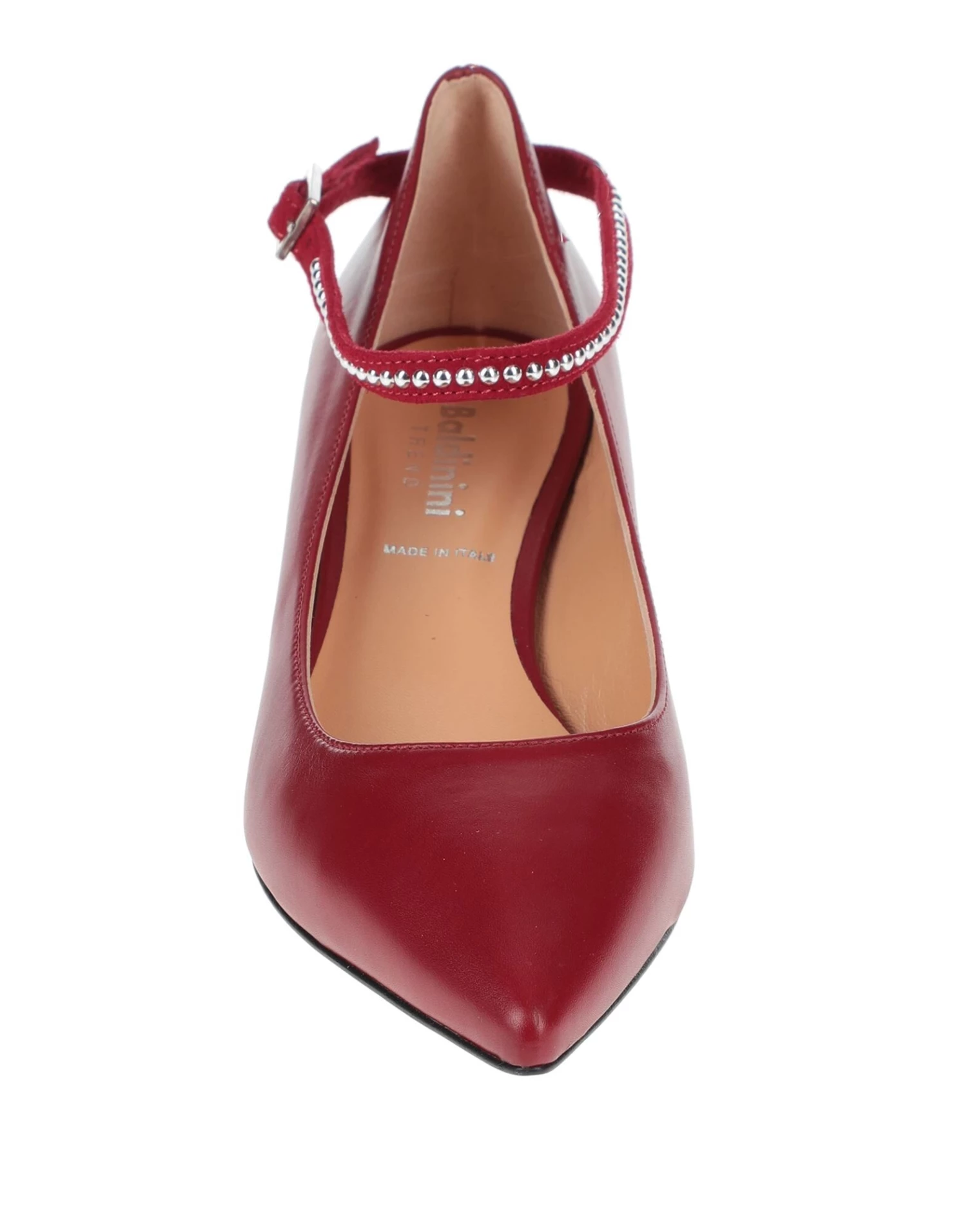 polished leather, studs, buckle, solid color, leather lining, narrow toeline, spool heel, leather sole, contains non-textile parts of animal origin