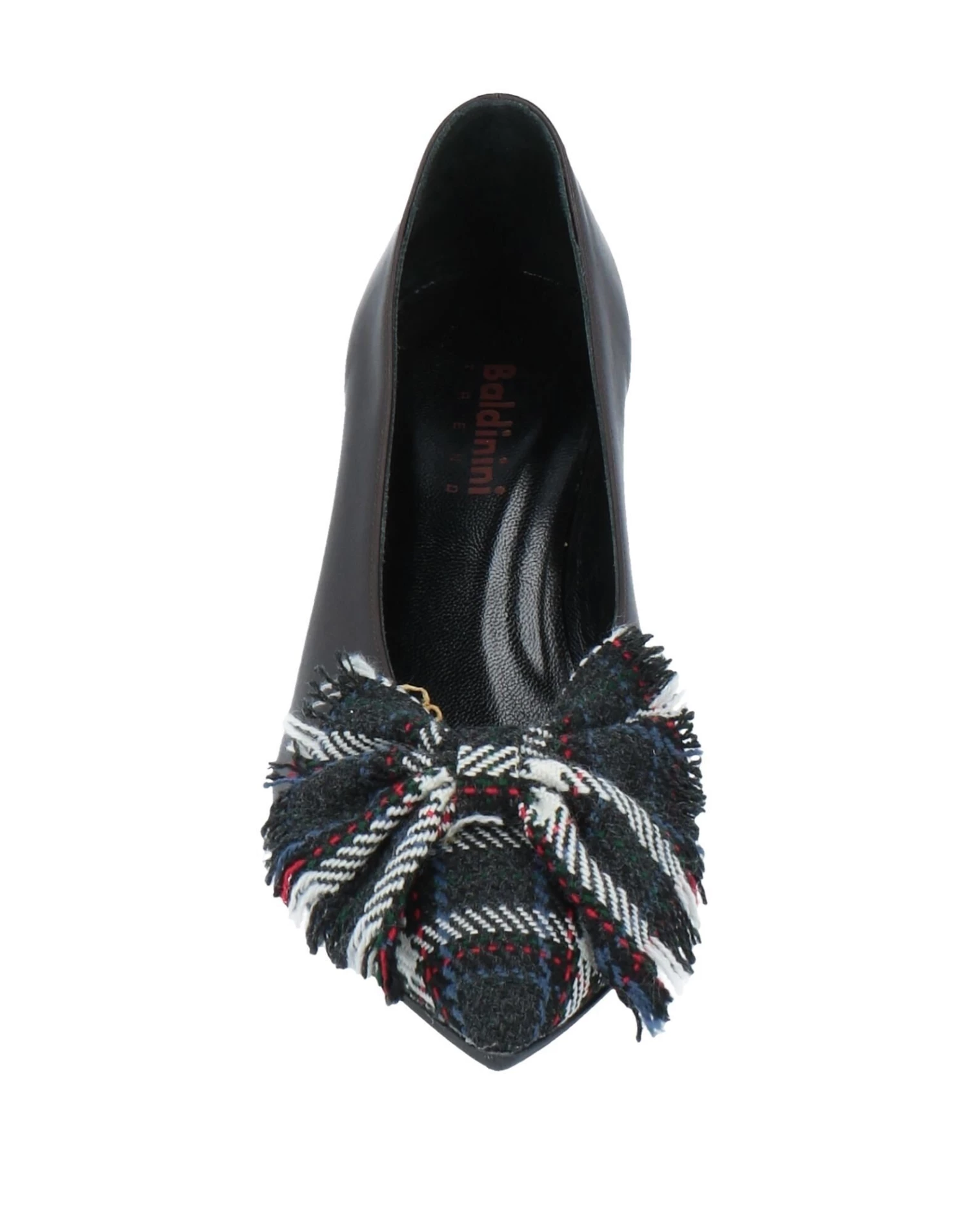 tweed, bow-detailed, tartan pattern, leather lining, narrow toeline, spike heel, rubber sole, contains non-textile parts of animal origin
