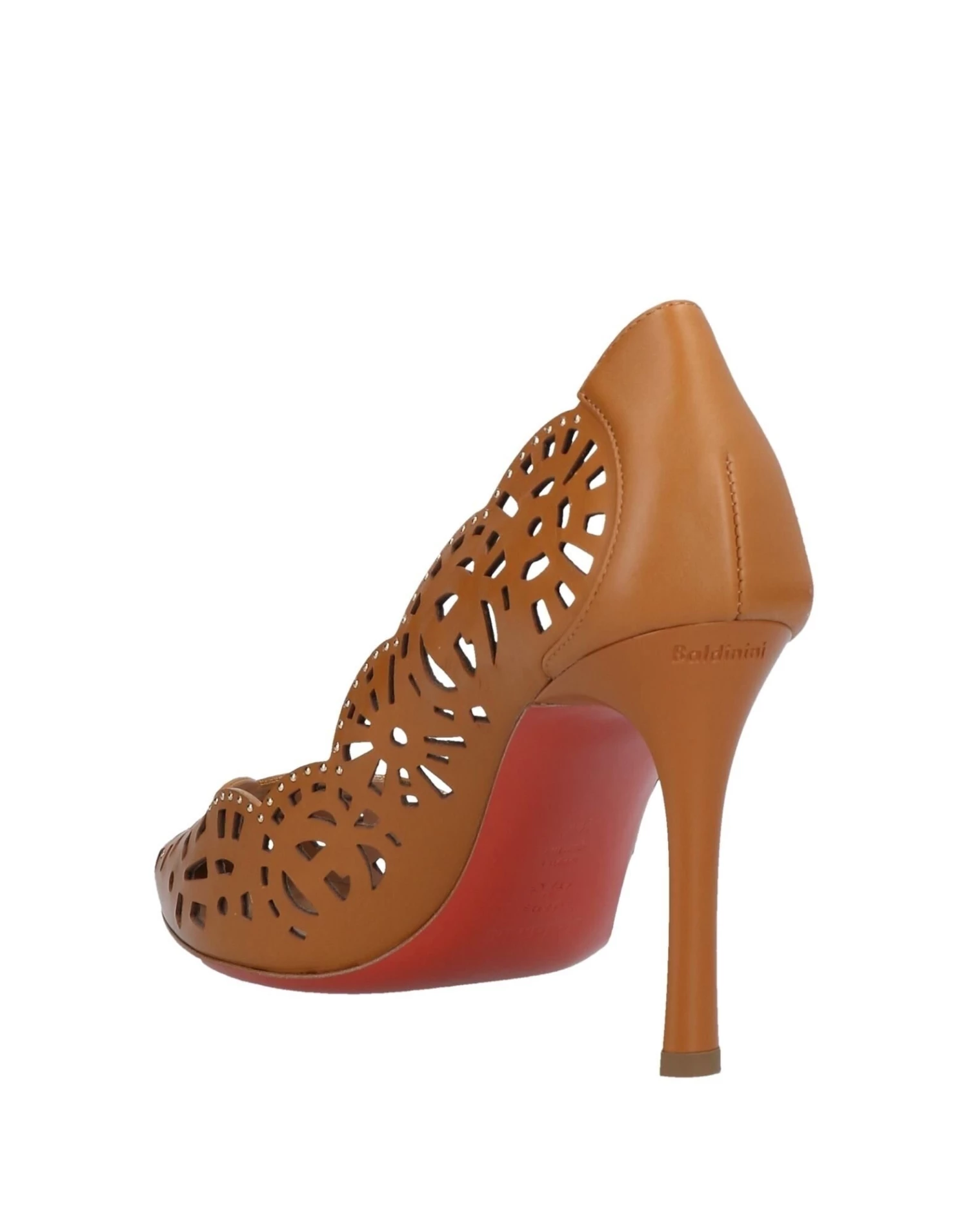 leather, openwork, metal applications, solid colour with appliqués, narrow toeline, stiletto heel, leather lining, leather sole, contains non-textile parts of animal origin