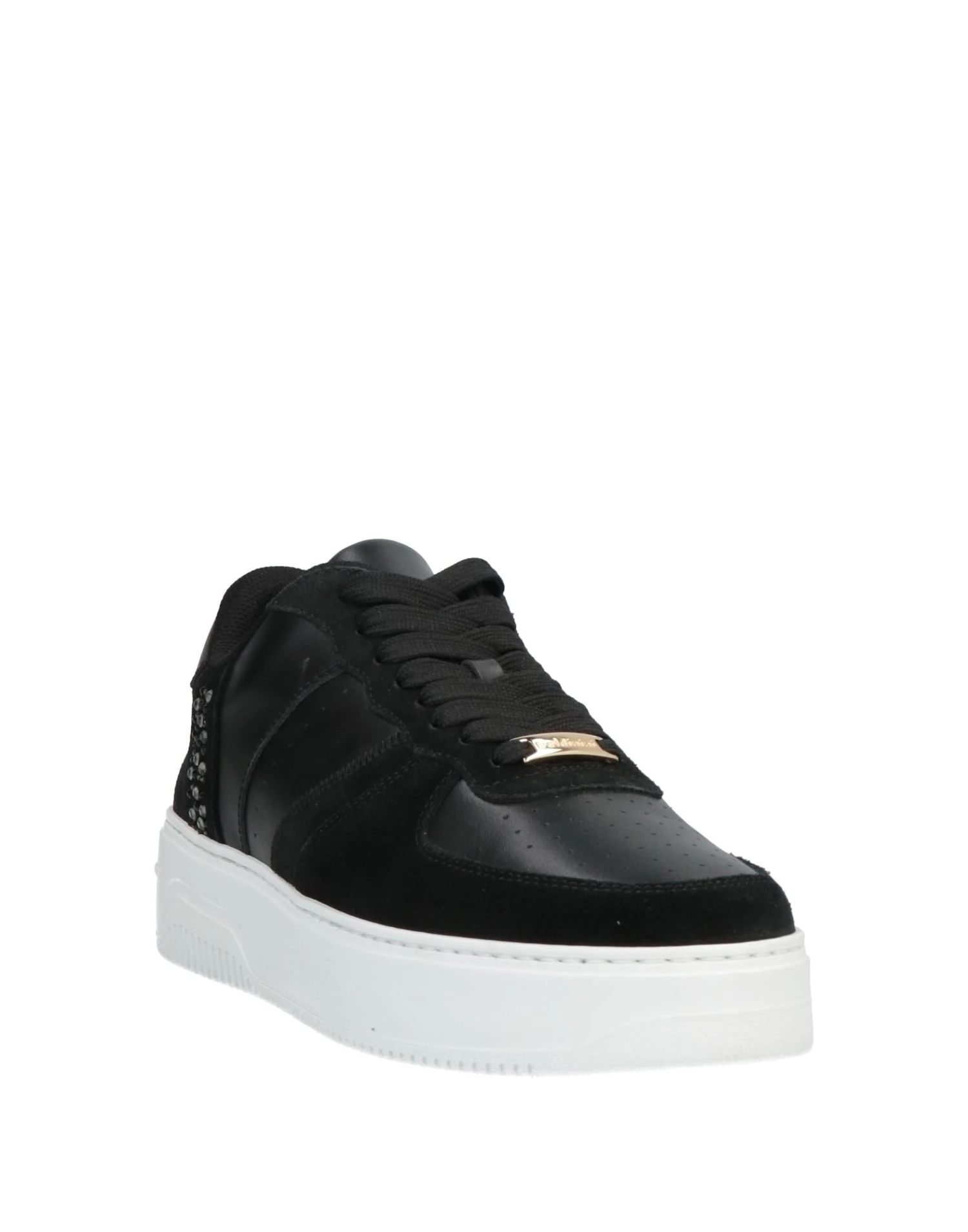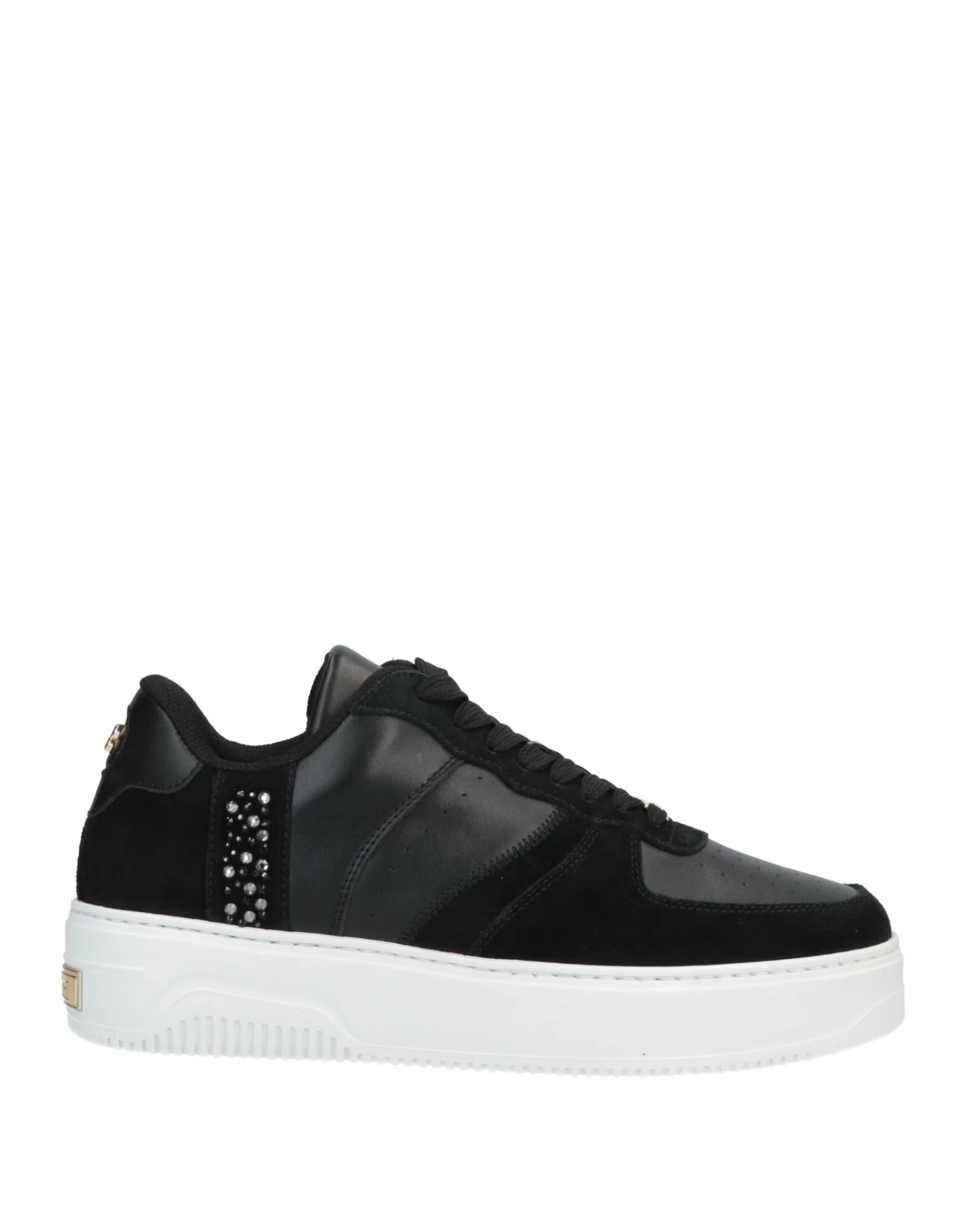 leather, suede effect, rhinestones, brand logo, solid color, fabric inner, laces, round toeline, flat, flatform, contains non-textile parts of animal origin