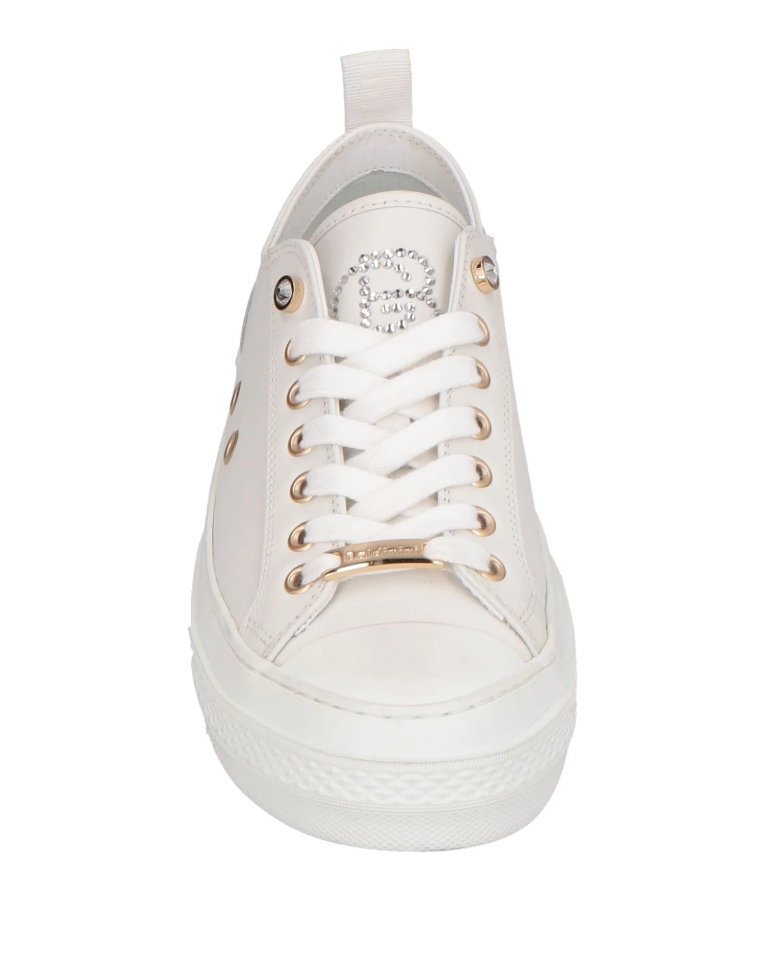 leather, rhinestones, brand logo, solid colour with appliqués, leather backing, laces, round toeline, flat, rubber cleated sole, contains non-textile parts of animal origin